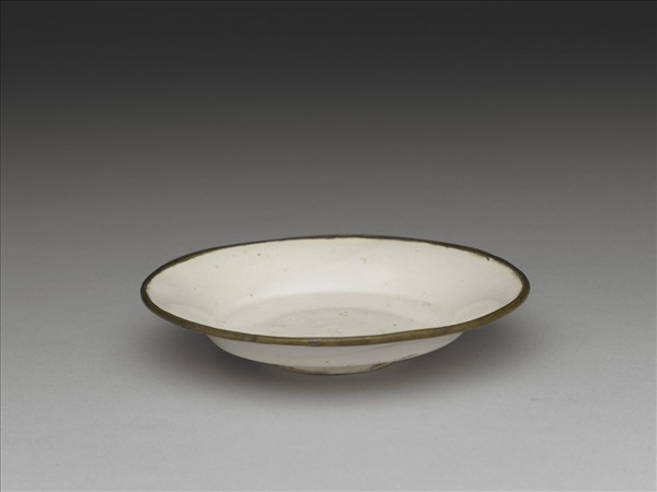 撇口折腰盤,器壁自口斜向下內收而呈弧形,淺腹,器腹中部向內折,碟心微凹,矮圈足;口緣無釉,鑲銅釦。碟心有細針狀支釘痕跡五枚。全器光素無紋飾,內外壁通體施釉,釉色牙白中帶灰,足端露胎有五墊燒片,足裡鏇紋清晰。此種支燒痕,類山西霍州窯製品。器表有舊傷。