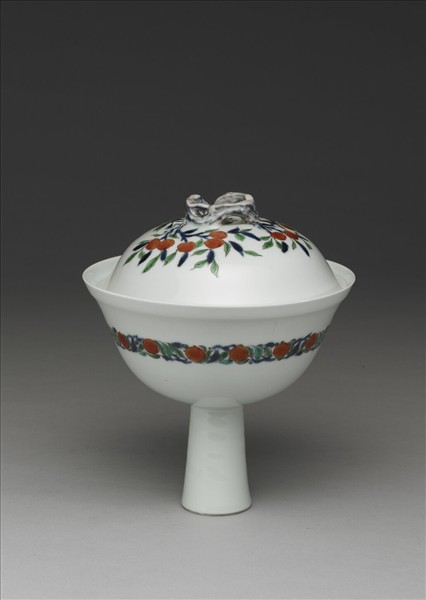 高足碗,碗侈口,深弧壁,高圈足,足壁斜直,帶圈頂蓋。全器內外通施白釉,碗心鬥彩畫樹石靈芝,加飾壽帶鳥二隻立於花樹枝頭,設色以青花點飾紅、綠、黑彩,圖案外有青線一道。碗外壁中央青花鬥彩畫轉枝桃實一周。蓋面彩畫桃枝三枝,附桃實共十四顆,甚繁麗。蓋頂雕作樹根形蟠曲,以鏤空手法表現樹根空隙,蓋頂中央又繪有桃實一顆附枝葉,與蓋頂樹枝相接。蓋內面純白無紋飾。薄胎骨,圈足足緣無釉露胎。碗心釉面有雜點。本件與故瓷12262形制、大小、紋飾皆極相似,惟蓋面紋飾桃枝、桃實佈局不同。