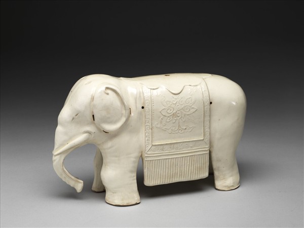 象一對,形態相同,惟尾部分向左右,背搭印花長帔,帔上加飾一荷葉形墊。胎骨厚重,內部中空。釉頗勻潤,面多冷紋。耳旁及背,腹、臀各部份,共有長圓小孔十三個,足底露灰白色。