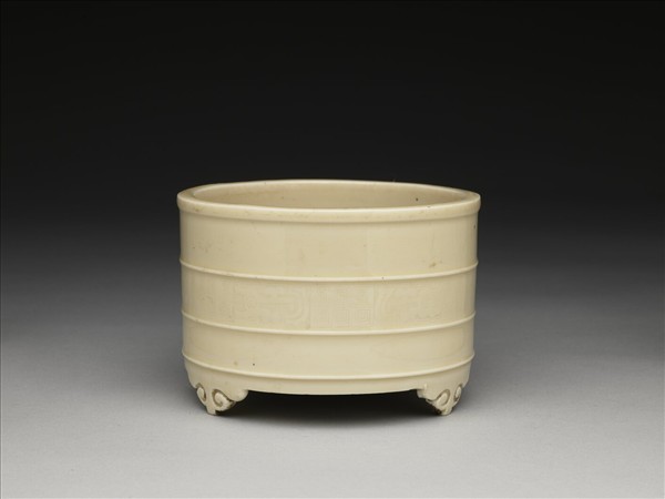 器呈短筒狀,口有方稜,底有三枚如意雲頭式足。器底隆起,而內底穿陷;從內底細密的鏇紋看來,此現象當是造柸時產生的。器外壁有整齊的凸稜,外壁沒有明顯的鏇痕,反倒是內壁稍有鏇柸痕。從筆直的短筒外形看來,此件筒式三足爐應當是使用樸子車柸的方式成形的。胎厚重。除了器內及外底,全器掛乳黃色不透明釉。外壁於兩稜之問壓印花紋,有陰文之回文作地子,六枚淺浮雕之夔龍紋。附玉頂木蓋,白玉雕成靈芝。