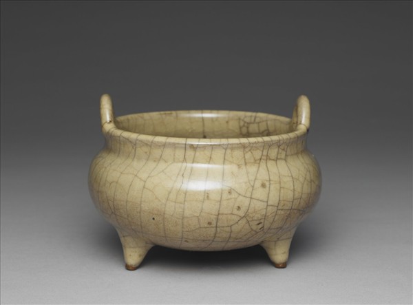 形仿青銅鼎形器,圓口,窄唇邊,口沿按雙立耳,短頸,圓碩腹,圜底接三乳形足。採支、墊結合方式裝燒,內外施青釉,燒後呈薑黃色,釉面開片裡外呈色不同,器內透明,器外淺棕與褐灰色紋路間雜出現。內底面有五枚支燒點,外底面六枚。除了上海市任氏墓出土腹部較扁的相仿器形外,浙江省杭州市老虎洞元代層窯址所見斷失立耳和圜底接乳形足的殘件,提示了這件展品可能的產地及與之相關的燒造脈絡。乾隆皇帝在乾隆二十至二十一年(1755-1756)之間降旨組合的「埏埴流光」多寶格中,也收錄一件類似的瓷爐,當時命名為「宋哥窯乳爐」。對照傳世品,也能在北京故宮博物院的收藏中發現相似的例証。