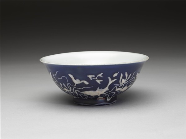 藍地堆白蓮塘游魚紋碗