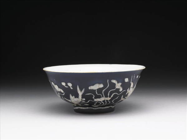 藍地堆白蓮塘游魚紋碗