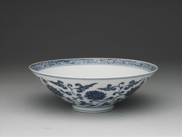 碗,侈口、深弧壁、矮圈足。胎骨薄,表面以青花彩繪紋飾,通體施白釉,足緣無釉露胎;青花濃艷,色深處多褐黃結晶疵斑。器內口沿飾卷草紋一周、上下加單雙弦紋,碗心飾一折枝牡丹外繞雙圈;器外口沿及底周繞雙弦紋,腹壁滿繪大小纏枝番蓮,外足圈見弦紋一道。