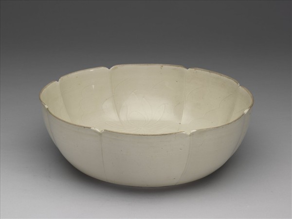 洗,八瓣牡丹花形,口微歛、深弧壁、平底、矮圈足。胎骨甚薄,底部稍厚;通體施白釉,釉色帶灰。覆燒,口沿露胎。器外壁依牡丹花口形壓八道凹線、內壁對應處起細稜,使器身分為八瓣。器內底繞弦紋一周,腹壁淺劃轉枝蓮花,線條簡約流暢;外壁隱約留有轆轤痕。