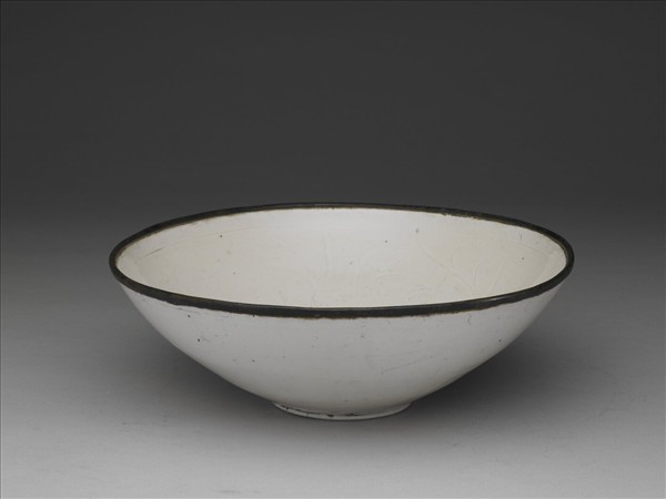 碗,侈口、深弧壁、平底、矮圈足,口緣鑲銅釦。胎骨薄,通體施白釉,釉質濃潤,色牙白。器內口沿及底周各淺劃弦紋一道 ,腹壁滿飾萱草,線條簡約流暢;外壁多傷。