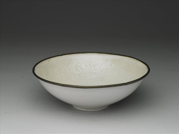 碗,六瓣葵花口、深弧壁、平底、矮圈足,口緣鑲銅釦。胎骨薄,通體施白釉,釉色勻潤。器內壁滿印纏枝牡丹花;底心飾一螭龍,餘隙填雲紋,印花精美細緻。
