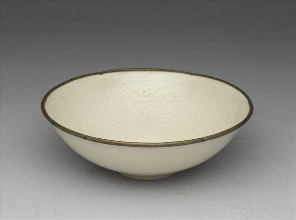 碗,六瓣葵花口、深弧壁、平底、矮圈足,口緣鑲銅釦。胎骨薄,通體施白釉,釉色勻潤。器內壁滿印纏枝牡丹花;底心飾一螭龍,餘隙填雲紋,印花精美細緻。