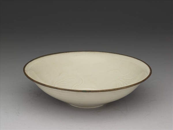 碗,侈口、深弧壁、平底、矮圈足,口緣鑲銅釦。胎骨稍厚,通體施白釉,釉質濃潤,外底及足緣微露胎。器內壁淺劃蓮塘景致,一雙鳧鳥悠遊其中,線條簡約流暢;外壁隱約留有轆轤痕。