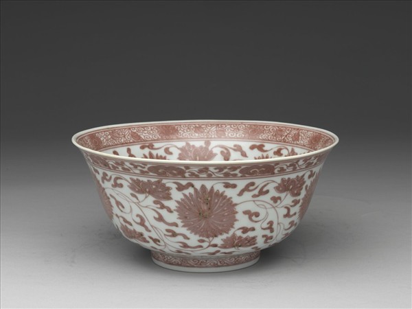 碗,撇口、深弧壁、矮圈足。胎骨上薄下厚,通體施白釉;紋飾以釉裡紅技法繪成,呈淺紅色。器內口沿繞纏枝菊花一周,內壁及底心均繪纏枝番蓮,紋飾間以雙弦紋作區隔。器外口沿飾轉枝靈芝一周、上下加雙弦紋,外壁滿飾纏枝番蓮,近底部見菊瓣紋,外足圈繪二道單弦紋,其間填卷草紋。