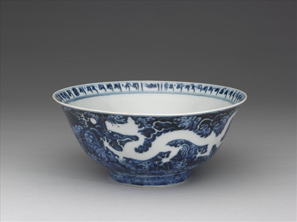 碗,撇口、深弧壁、矮圈足。胎骨薄,通體施鈷藍釉彩,色濃艷,足緣無釉露白胎。器內口沿書梵文一周、上下分別繞單雙弦紋;腹壁印有雲龍,底周繞雙弦紋,內填波濤、洶湧澎湃,其間留白處作龍戲珠圖。器外口沿及足沿均繞雙弦紋,外壁滿繪波濤紋,留二組龍戲珠、翻騰於波濤間。