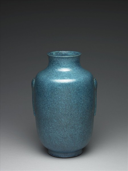 小口帶撇,收頸寬肩,碩腹,矮圈足。雙肩處以貼花作二高足杯式凸起,為暗耳。全器施爐鈞釉,色深藍帶深淺變化,有藍點,光采晶亮,凝重典雅。圈足露胎處繪深棕色,底刻「大清道光年製」六字二行篆款。爐鈞釉為低溫釉,先以高溫燒就素胎,再於胎上施釉低溫烘烤。