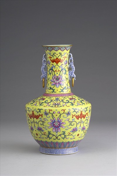 粉彩黃地福壽紋活環雙耳瓶
