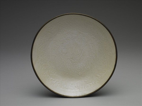 大盤,侈口,淺弧壁,平底,矮圈足,口沿鑲銅釦。全器施白釉,釉色泛灰。器內印花為飾,口沿下兩道弦紋,內壁滿印蓮花孔雀紋。底心印蓮花鳧鵝紋飾,邊印回紋一周。