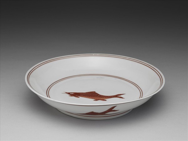 侈口窄唇,淺壁,矮圈足。盤心與外壁分畫紅魚五尾,內外分飾紅線八道。胎質較薄,釉色潔白。