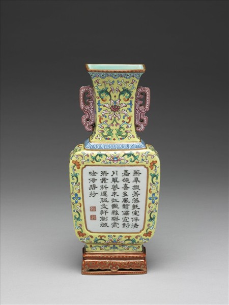 扁方形,侈口,短頸,長腹,下連長方座,頸飾兩蟠螭耳,背有方、圓小孔。器面彩畫纏枝番蓮花,加飾回紋與如意雲各一道。腹部開光,墨書乾隆題詩:「蘅皋掇菁藻,氈室伴清嘉,卻喜多風韻,偏宜對月華,蔘來紅艷夥,暎處綠叢斜,還從文軒側,微吟倚碧紗。」描紅印章二:「乾」、「隆」。瓶座硃紅地,描金花卉。底有金書「大清乾隆年製」六篆字橫款。