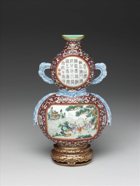 仿葫蘆形,上截飾有兩耳,腰作繫帶紋,底連鏤空座。器周邊彩畫纏枝番蓮花,器面開光,上截墨書篆文乾隆題詩:「雲山縹緲列仙鄉,海隔紅塵路渺茫,只許人間圖上看,廣寒宮殿午風凉。」描紅印章二:「乾」、「隆」。下截彩畫仙人、樓閣。座畫描金花卉。底有金書「大清乾隆年製」六篆字款。