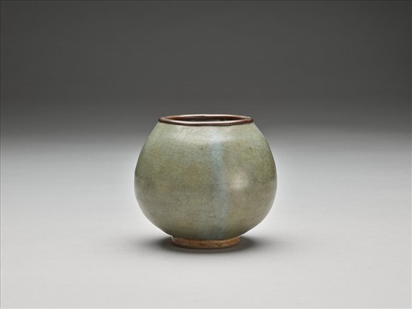 斂圓口、深弧壁,矮圈足。全器罩施天青色釉,釉表開灰色細紋片,外壁並有天藍流釉痕,口沿殘缺一段,加嵌銅釦。施釉不到底,圈足外壁、底緣、內周壁皆露土色胎,外底局部沾釉,中心微凸。
