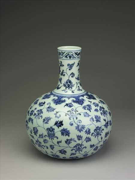 永樂年間的天球瓶,除以穿蓮龍紋最為知名,另一類全器滿佈纏枝花卉紋者也是此時代表性作品。這件天球瓶圓口,長頸,腹部豐碩,平底無足。釉白處略泛青,全器以青料畫滿纏枝番蓮花紋,紋飾暈散,肩部畫雲頭紋一周,花紋間加飾青線七道。瓶底露出胎體,沒有施釉。