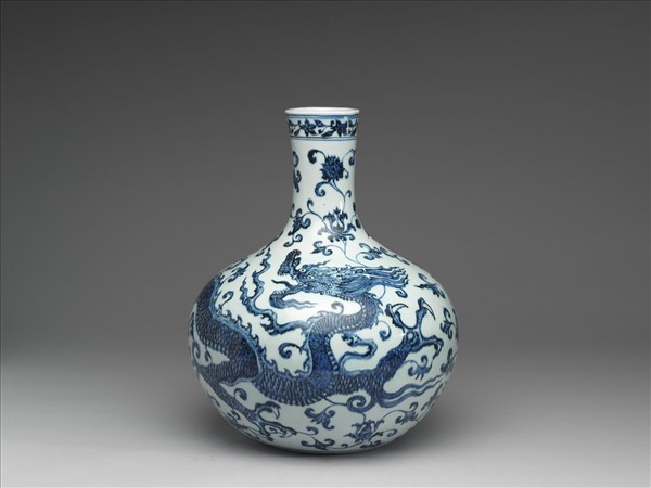 侈口,直頸,圓鼓腹,平底略凹,無足。天球瓶因形似天上星球故名,器型為永樂官窯所創製。口沿下畫花卉紋一周,上下各加飾青線二道,圓腹通體繪一回首穿蓮三爪行龍,張口、吐舌、露牙、雙目圓睜,闊步奔行,龍身滿畫鱗甲,雄武矯健。瓶頸、隙地滿畫轉枝蓮紋。青花鮮豔濃重,多處帶褐綠斑或鐵褐結晶疵斑,並滲青斑點。白釉泛青,內壁尤甚。胎骨厚重,底部露胎處,質堅細膩泛橘紅色,肩腹間接痕三道。明永樂、宣德年間,盛行燒製大型器,如天球瓶、扁壺等,紋飾多以龍紋及花卉紋最為常見。永樂天球瓶造型、紋飾雄偉精緻為其時代特色。