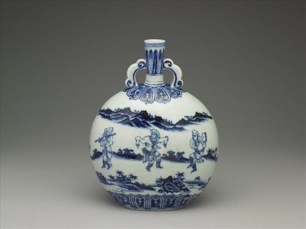 明永樂扁壺,如意耳扁壺的器形受到中西亞陶器及玻璃器的影響。小口,細頸,腹部扁圓,平底無足,頸部兩側各有一弓形耳連接頸部和肩部。全器以青花為飾,頸上畫青花蕉葉紋。腹部兩面畫山水,肩部及近底處各畫仰覆蓮瓣紋一周。腹部中央如同一小景,前景有坡石水腳,中景為樹石。扁壺一面有三人,另一面有二人,共有樂舞人物五名於遠山近景間。人物的臉容、服飾呈現異族面貌。人物的姿態與組合和十四世紀伊斯蘭祈求乾涸泉水再度流動的畫作相當近似。以人物作為裝飾主題的如意耳扁壺存世目前所知僅有二件,一件典藏於本院,另一件收藏於土耳其伊斯坦堡的托普卡普宮殿博物館,十分可貴。
