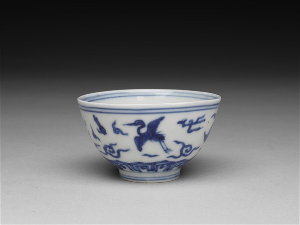 敞口,深壁,矮圈足。外壁畫雲鶴四隻,加飾爐、笙等。底心畫雲紋一朵,邊加雙線,周壁純白無紋飾。底邊畫蓮瓣紋一周,口足分飾青線六道。底有青花書「大明嘉靖年製」六字二行楷款,外加雙圈。