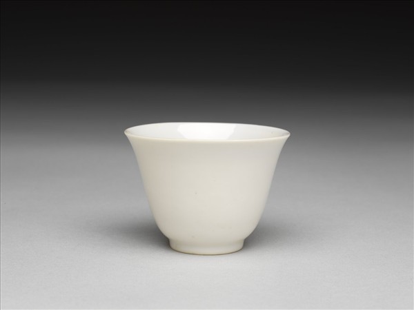 侈口,深壁,矮圈足。內壁錐拱纏枝牡丹花。半脫胎,甜白釉,花紋外面可見。底有青花書「大明萬曆年製」六字二行楷款,外加雙圈。