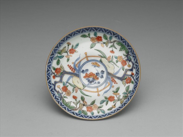 敞口,淺弧壁,矮圈足。外壁光素無紋,口沿塗金彩,內壁中心畫一株牡丹,周飾雙圈青線。內周壁繪飾花木扶疏的場景,樹下有石頭,旁邊為有金色欄杆,花朵以紅、金色釉料彩繪而成。口沿處飾一圈交錯三角形紋。碟外底繪飾青花花葉圖案。圈足底緣局部脫釉。