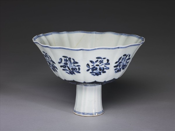 青花團花紋葵瓣口高足碗