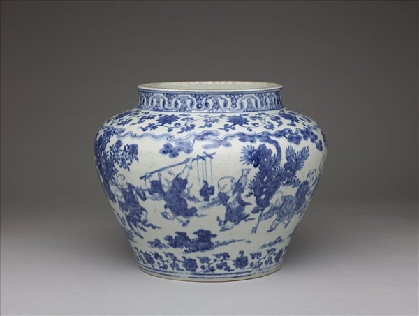 斂口,短頸,碩腹,淺圈足。器頸畫如意雲一周,腹部畫庭園景物,十六兒童嬉戲其中。上下各加飾纏枝番蓮,口足分飾青線五道。底青花楷書「大明嘉靖年製」,外加雙圓圈。