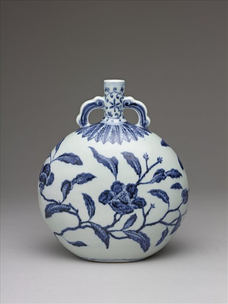 長管狀頸接圓扁腹壺,頸部中央與器身間以捲雲形雙耳連繫,因腹圓如滿月,俗稱「抱月瓶」或「寶月瓶」。此器由上下接合而成,形制仿自伊斯蘭玻璃器,中國的作品則始於永樂朝。口緣弦紋,器頸飾纏枝花紋,器身接蕉葉紋一圈,兩面皆繪山茶花紋,器底略凹而無釉。景德鎮珠山東門頭永樂地層亦出土相似作品,本院亦有以胡人舞蹈為主紋者。