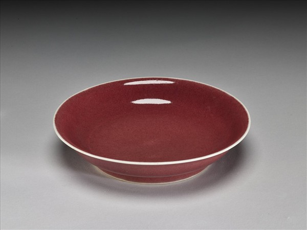 侈口窄唇,淺弧形壁,矮圈足。全器施霽紅釉,施釉至足邊,口沿與足邊各留一道白邊,足緣無釉露白胎。足內壁及底施白釉,底有青花書「大明宣德年製」六字二行楷款,外加雙圈。