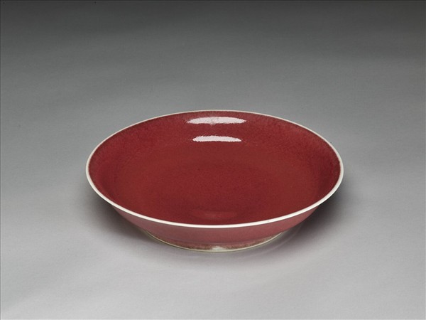 侈口窄唇,淺弧形壁,矮圈足。全器施霽紅釉,施釉至足邊,口沿與足邊各留一道白邊,足緣無釉露白胎。足內壁及底施白釉,底有青花書「大明宣德年製」六字二行楷款,外加雙圈。