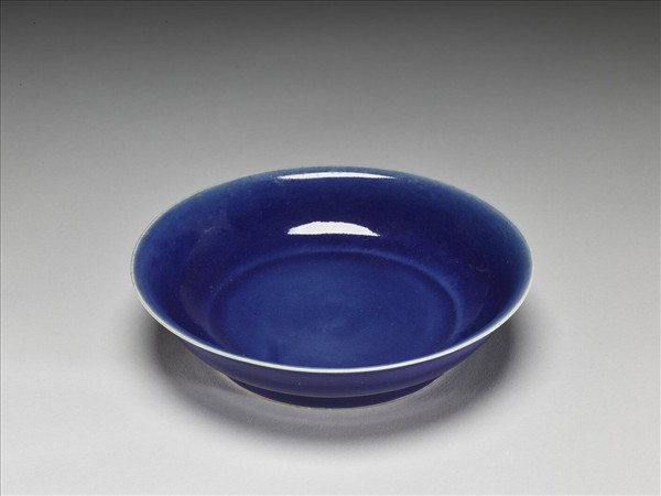 侈口窄唇,淺弧形壁,矮圈足。全器施霽青釉,施釉至足邊,口沿與足邊各留一道白邊,足緣無釉露白胎。足內壁及底施白釉,底有「大明宣德年製」六字二行楷體暗款,外加雙圈。