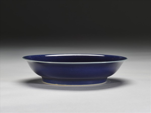 侈口窄唇,淺弧形壁,矮圈足。全器施霽青釉,施釉至足邊,口沿與足邊各留一道白邊,足緣無釉露白胎。足內壁及底施白釉,底有青花書「大明宣德年製」六字二行楷款,外加雙圈。