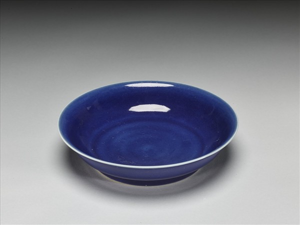 侈口窄唇,淺弧形壁,矮圈足。全器施霽青釉,施釉至足邊,口沿與足邊各留一道白邊,足緣無釉露白胎。足內壁及底施白釉,底有「大明宣德年製」六字二行楷體暗款,外加雙圈。