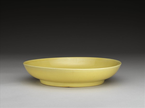 敞口窄唇,淺壁,矮圈足。胎骨稍厚,器內外壁滿施嬌黃釉,盤底純白,樸素無紋飾。底有青花書「大明嘉靖年製」六字二行楷款,外加雙圈。