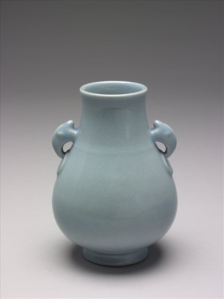廣口瓷瓶,粗頸,垂肩,梨型腹,矮圈足。頸飾弦紋一道,兩側各立一獸首銜環耳。胎骨厚,通體施天青釉,釉表密佈細開片。足底露胎,塗有淡赭色護胎釉。外底心書「大清雍正年製」六字青花篆款。敞口耳瓶作為花器,在清代相當常見,丁裕(活動於1647年間)畫〈後天不老冊.納涼〉(故畫03415-7),畫中三位老者正在觀瓶荷,石案上青瓷獸耳橄欖尊插粉色夏荷四朵,荷葉及紅蓼作補枝。枝幹中出花型,枝腳成把,瓶口潔淨。當時文人對花藝的看法分歧,同為清康熙年代的陳書畫〈花卉.折枝瓶花〉(故畫03245-7),敞口銅瓶插黃菊或碎器瓷瓶插芙蓉幾枝,並刻意叢聚於瓶口,選擇了明代高濂的花型。不過,清乾隆年間,沈三白寫《浮生六記》(1808年著)即主張:「瓶口取闊大,…闊大者舒展…必于瓶口中一叢怒起…不靠瓶口為妙;所謂『齊把宜緊』也。」足見在當時文人自由創作的氛圍下,花藝也如百花齊放般精彩!