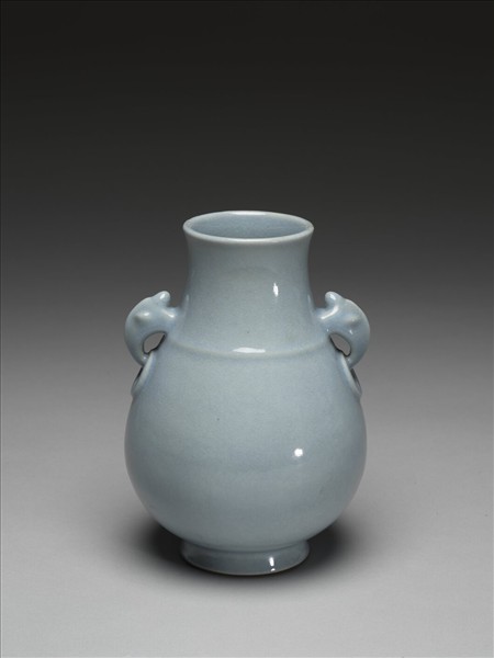 侈口,短頸,腹部上斂下豐,矮圈足。頸飾兩獸首銜環耳及弦紋一道。胎骨厚,通體天青色,釉面密佈細碎紋片。足底露胎,塗有淡赭色汁。底有青花書「大清雍正年製」六字篆款。