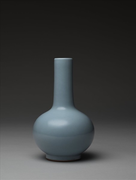 斂口,長頸,碩腹,矮圈足。厚胎濃釉,天青色,純潔無紋片。足底露胎,塗有淡赭色汁。底有青花書「大清雍正年製」六字篆款。