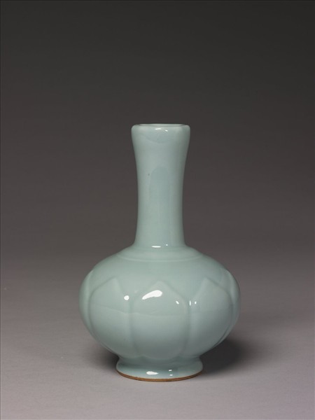 瓶口微撇,細直長頸,平肩圓折,扁圓腹下斂,矮圈足微撇。腹部拱出九蓮瓣紋,器身似扁型含苞荷花,釉色天青腴潤潔淨。足露白胎,施淡赭色謢胎釉。底心青花書「大清雍正年製」六字篆書款。 長頸瓶作為插花器皿,早在唐代敦煌壁畫墓中已見,且不斷成為各個朝代花藝擇器的重要選項。就功能來推測,細頸可使植物枝幹挺直靠頸壁,枝腳緊靠成把,具有固定花葉位置的功能,或也因此而歷時不衰。例如院藏清孫祜〈萬壽圖冊.壽翁對弈〉(故畫03372-2),石案上扁圓肚長頸瓶中插白壽菊三朵,姿態各異;與畫中神采奕奕的對弈老叟,互相呼應。如此景象也只有可挺直依附瓶身的花葉枝幹才得以呈現。