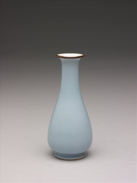 長頸,垂膽腹,矮圈足,梯形足底。施天青釉至足際,器內及底施白釉,足底殘留褐色護胎汁,部份露白胎,為清康熙時期的作品。口沿繪褐釉一圈,為仿金屬釦的概念,是明嘉靖以來貿易瓷常見的裝飾方式。
