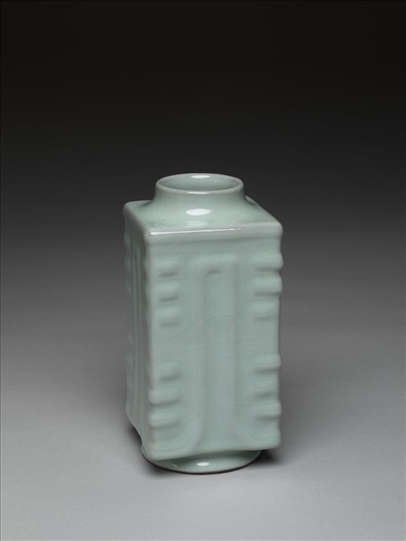 仿古玉琮形制,飾弦紋三條二組。胎骨厚重,釉色天青,面現裂璺。足底露胎,塗有淡赭色汁。底有青花書「大清乾隆年製」六字篆款。
