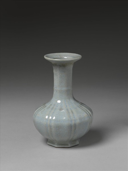 瓶體八稜,圓盤形口,長頸,碩腹,矮圈足。胎骨厚重,釉色天青,滿佈細密紋片。足底露胎,塗有淡赭色汁。底有青花書「大清乾隆年製」六篆字款。