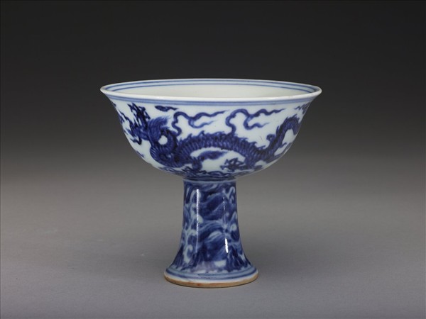 撇口,深弧壁,高足外侈,平底。外壁畫雲龍二條,足上隙地滿畫波濤、山石,內外口沿、底邊、高足上等共加飾青線九道。內面純白無紋飾。器內心有青花書「大明宣德年製」二行六字楷款,外加雙圈。