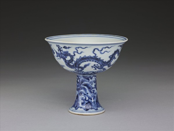 撇口,深弧壁,高足外侈,平底。外壁畫雲龍二條,足上隙地滿畫波濤、山石,內外口沿、底邊、高足上等共加飾青線九道。內面純白無紋飾。器內心有青花書「大明宣德年製」二行六字楷款,外加雙圈。