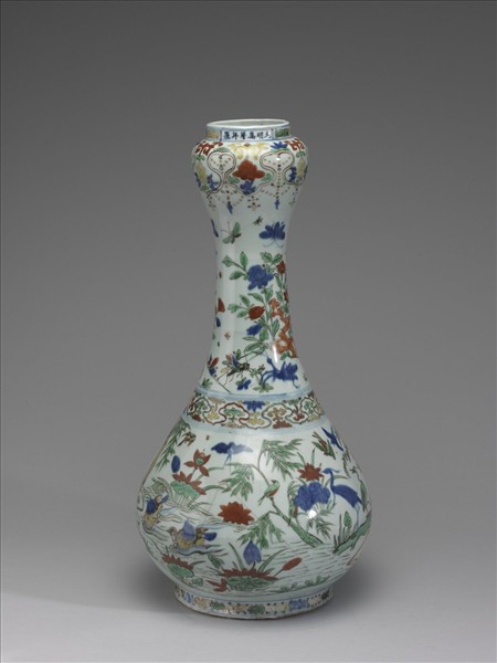 明 萬曆 五彩花鳥紋蒜頭瓶