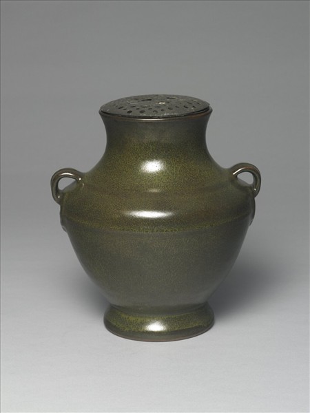 撇口、短頸、寬肩、斂腹、平底、圈足外撇。肩兩側對飾半圓形立體雙繫環,繫下另貼飾凸起暗環,環肩亦飾凸稜兩道。器底刻「雍正年製」雙行四字篆款。對照唐英〈陶成紀事碑〉記載,此品或屬其中「仿廠官窯」一類作品。