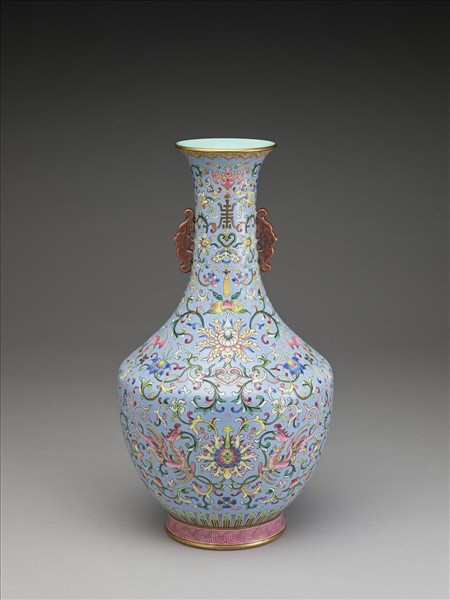 粉彩淺藍地番蓮紋蝠耳瓶