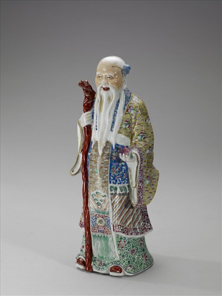 瓷製站立老者像,頂上梳髻,蓄長髯,鬚眉皆白,臉上笑容和煦。老者右手持杖,左手捧壽桃。身穿寬大飄逸長袍,上半身服飾上層為黃地,飾滿壽桃與團壽字,接藍地丹頂鶴與花卉紋,底層飾波濤紋與三角紋。下半身服飾為綠地飾花葉紋。足穿紅鞋。因桃實帶有長壽意涵,故此老者為壽星。底部露胎,墨書「斗」,帶一孔。